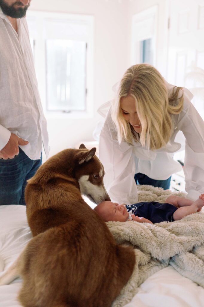 This session with Alex Anne, Michael, baby Fancher, and Timberlake took place in their cozy South Huntsville home, where the soft morning light poured into their bedroom and set the most peaceful tone. Fancher stayed snuggled in his mama’s arms most of the time while Timberlake hovered close by, ever watchful and protective.